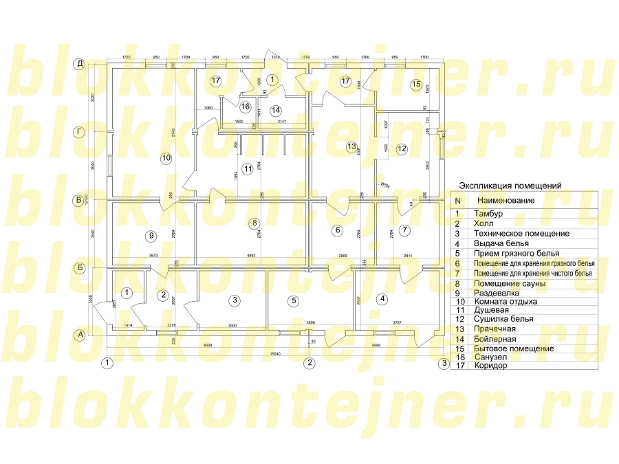 Модульное здание «Баня с прачечной »   в 1-этаж, размер: (12,0 *14,7*3,0м) состоит из 12 единиц БК размер 6,0*2,4*2,5м: