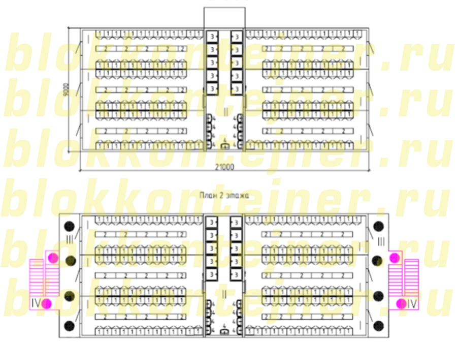 Модульное здание «Бытовое»   в 2-этажа, размер: (7,5 *20,5*2,5м) состоит из 14 единиц БК размер 9,0*2,4*2,5м.: